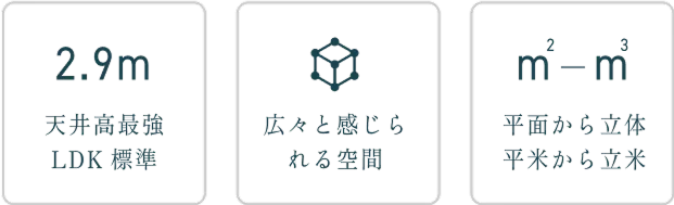 天井高が2.9mあれば、視界から天井が消えて圧迫感がなくなり、解放感が得られます。高さは自分らしさを表現するスペースであり、収納力も備えています。